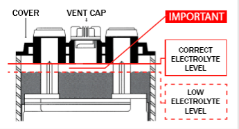 - After charging, check the electrolyte level again and add distilled or deionized water to ¼” below the vent well (see diagram) to cover the plates if low. Never add electrolyte